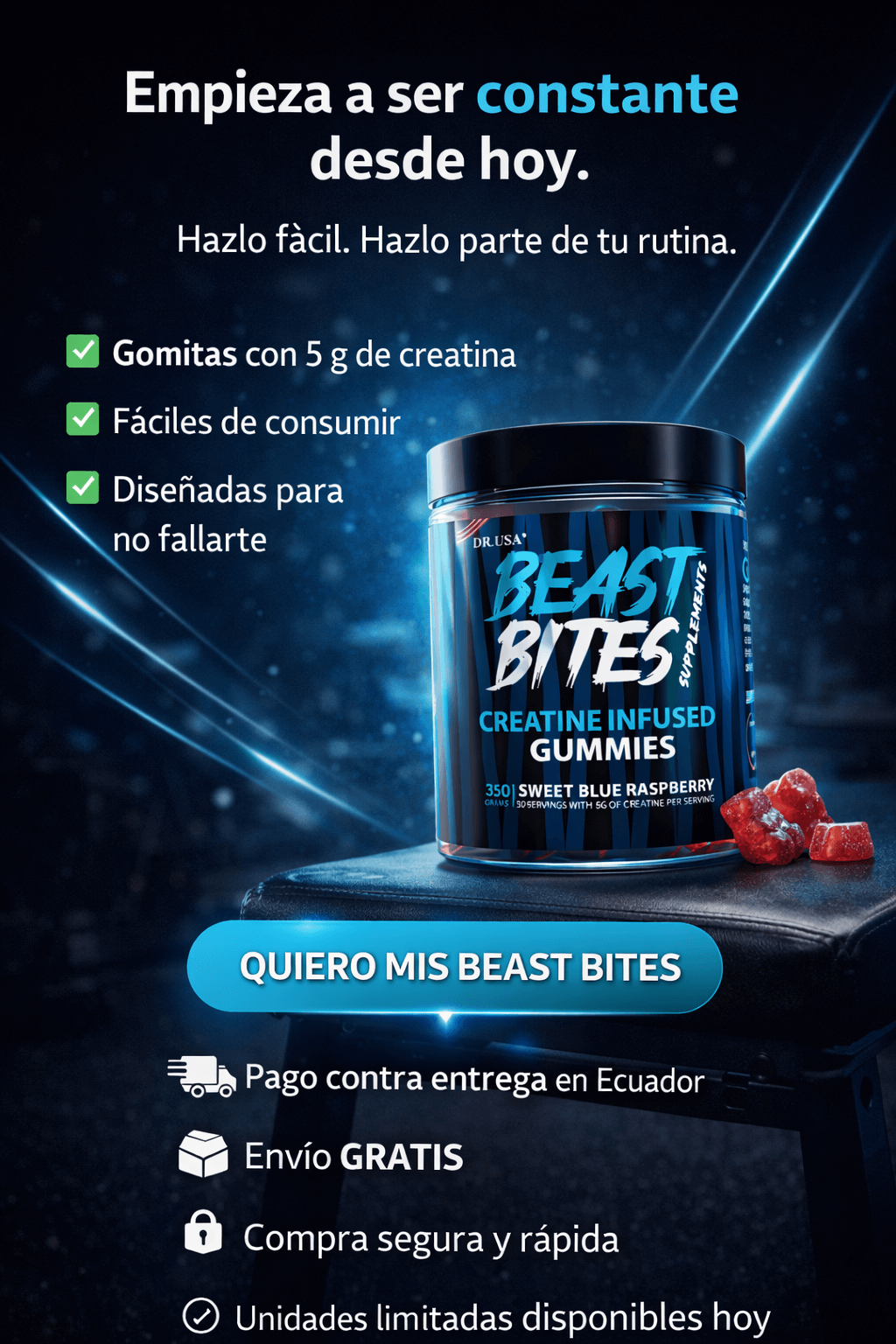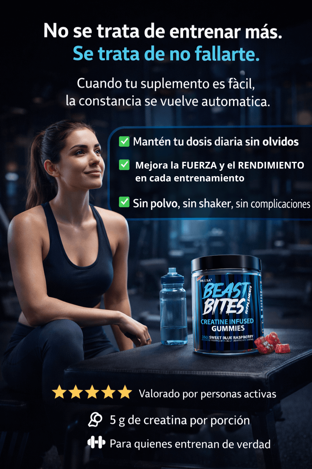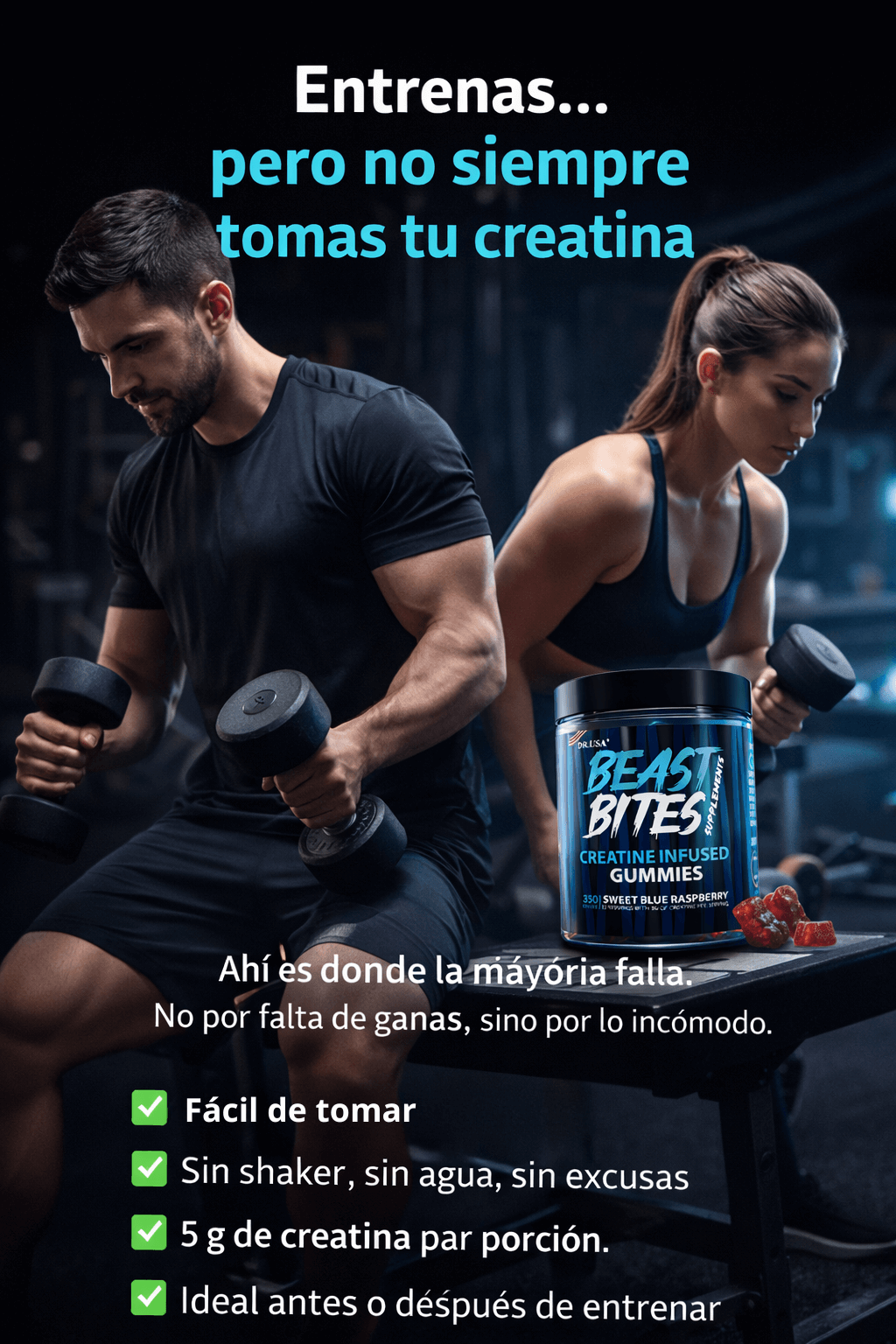 La creatina es un suplemento ampliamente utilizado en el entrenamiento. Beast Bites apoya el consumo constante de creatina, lo cual es clave para quienes entrenan de manera regular. Los resultados dependen del entrenamiento, la alimentación y la constancia.
